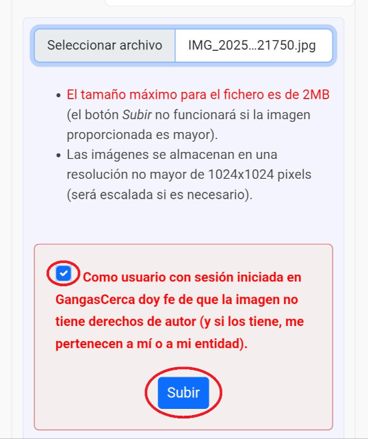 Marca la casilla en la que declaras que la foto es tuya o no tiene derechos de autor y pulsa en el botón "Subir".