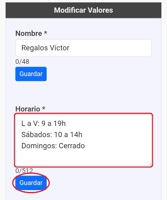 Baja hasta la zona en la que está el campo "Horario", rellena la caja y pulsa en "Guardar".